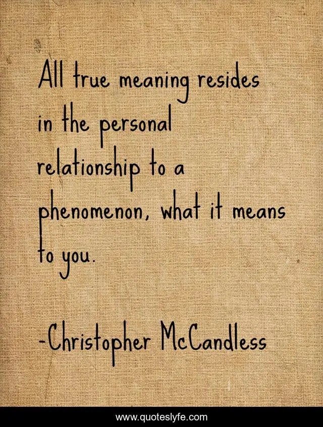 This page presents the quote "All true meaning resides in the personal relationship to a phenomenon, what it means to you.". Author of this quote is Christopher McCandless. This quote is about personal, meaning,.