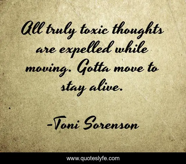 This page presents the quote "All truly toxic thoughts are expelled while moving. Gotta move to stay alive.". Author of this quote is Toni Sorenson. This quote is about thinking, brain, cleanse, thoughts, movement,.