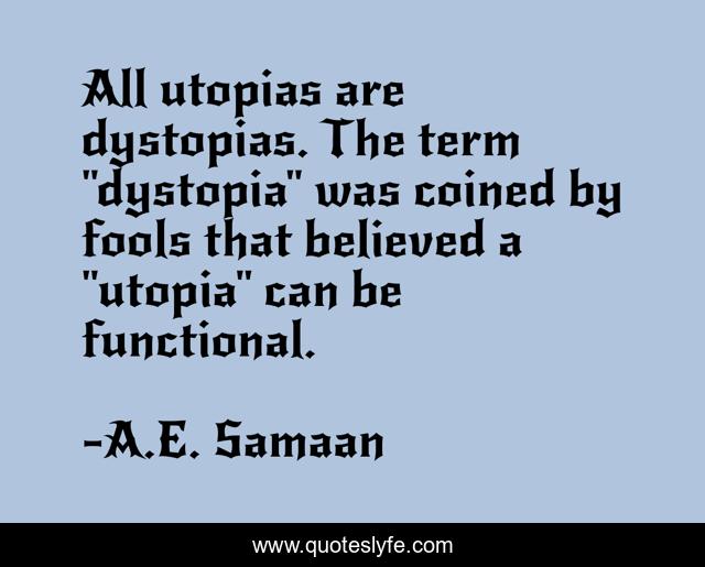 This page presents the quote "All utopias are dystopias. The term "dystopia" was coined by fools that believed a "utopia" can be functional.". Author of this quote is A.E. Samaan. This quote is about dystopia, dystopian, utopias, libertarianism, central-planners, totalitarian, liberty, planned-economies, socialism,.