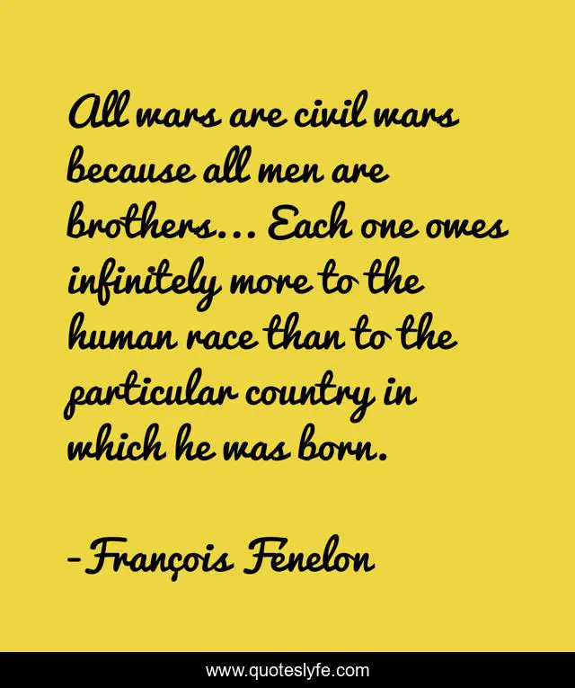 This page presents the quote "All wars are civil wars because all men are brothers... Each one owes infinitely more to the human race than to the particular country in which he was born.". Author of this quote is François Fénelon. This quote is about patriotism, humans, nationalism, humanity, war,.