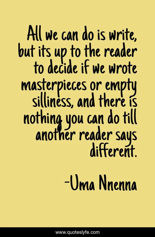 This page presents the quote "All we can do is write, but its up to the reader to decide if we wrote masterpieces or empty silliness, and there is nothing you can do till another reader says different.". Author of this quote is Uma Nnenna. This quote is about writers, christian-authors, umannenna, writingtips, authors,.