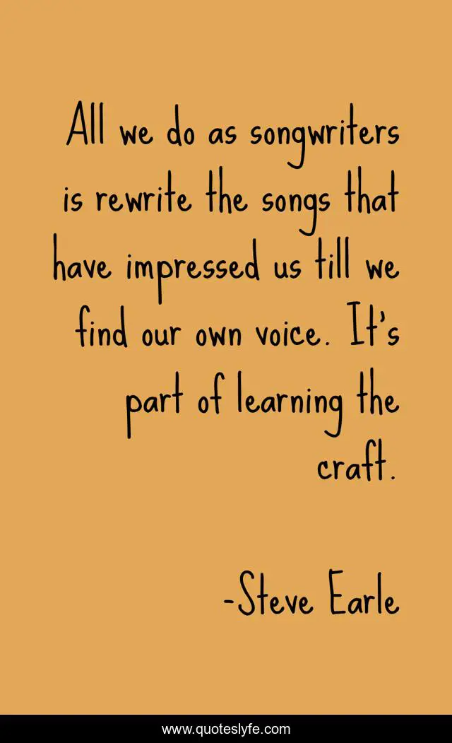 This page presents the quote "All we do as songwriters is rewrite the songs that have impressed us till we find our own voice. It's part of learning the craft.". Author of this quote is Steve Earle. This quote is about voice, craft, find,.
