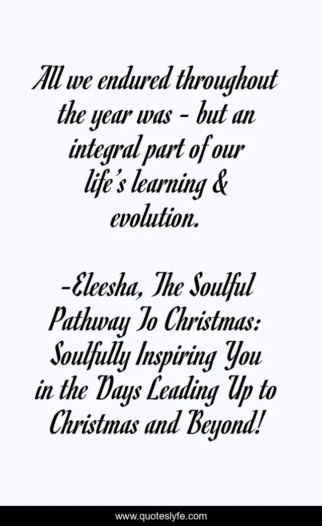 This page presents the quote "All we endured throughout the year was - but an integral part of our life’s learning & evolution.". Author of this quote is Eleesha, The Soulful Pathway To Christmas: Soulfully Inspiring You in the Days Leading Up to Christmas and Beyond!. This quote is about christmas-spirit, positive, motivational, empowerment, soul, quotes, channeling, inspirational, affirmations,.
