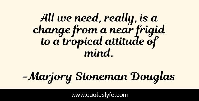 This page presents the quote "All we need, really, is a change from a near frigid to a tropical attitude of mind.". Author of this quote is Marjory Stoneman Douglas. This quote is about need, mind, change,.
