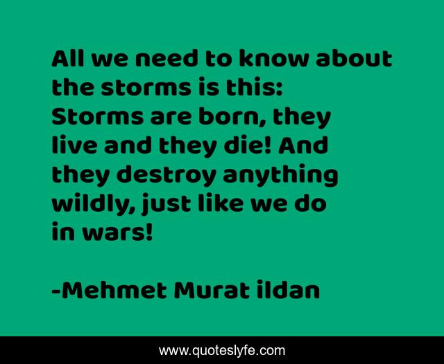 This page presents the quote "All we need to know about the storms is this: Storms are born, they live and they die! And they destroy anything wildly, just like we do in wars!". Author of this quote is Mehmet Murat ildan. This quote is about mehmet-murat-ildan, ildan-wise-sayings, turkish, ildan-wisdom, storms, turkish-playwrights, wars, turkish-wisdom-words, storm,.