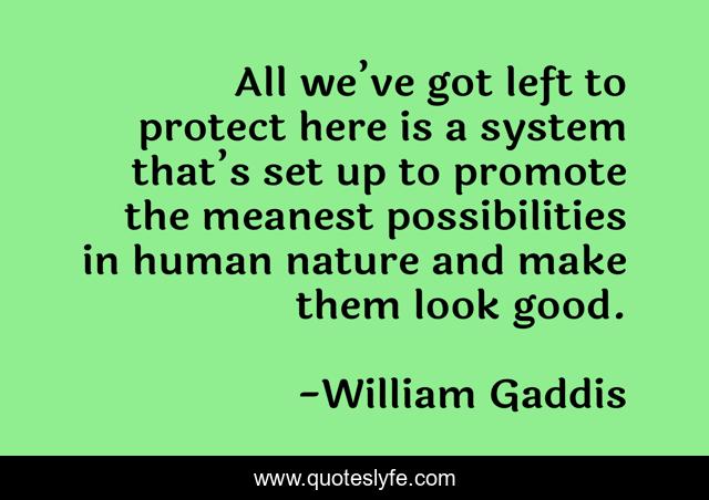 This page presents the quote "All we’ve got left to protect here is a system that’s set up to promote the meanest possibilities in human nature and make them look good.". Author of this quote is William Gaddis. This quote is about humanity, capitalism,.
