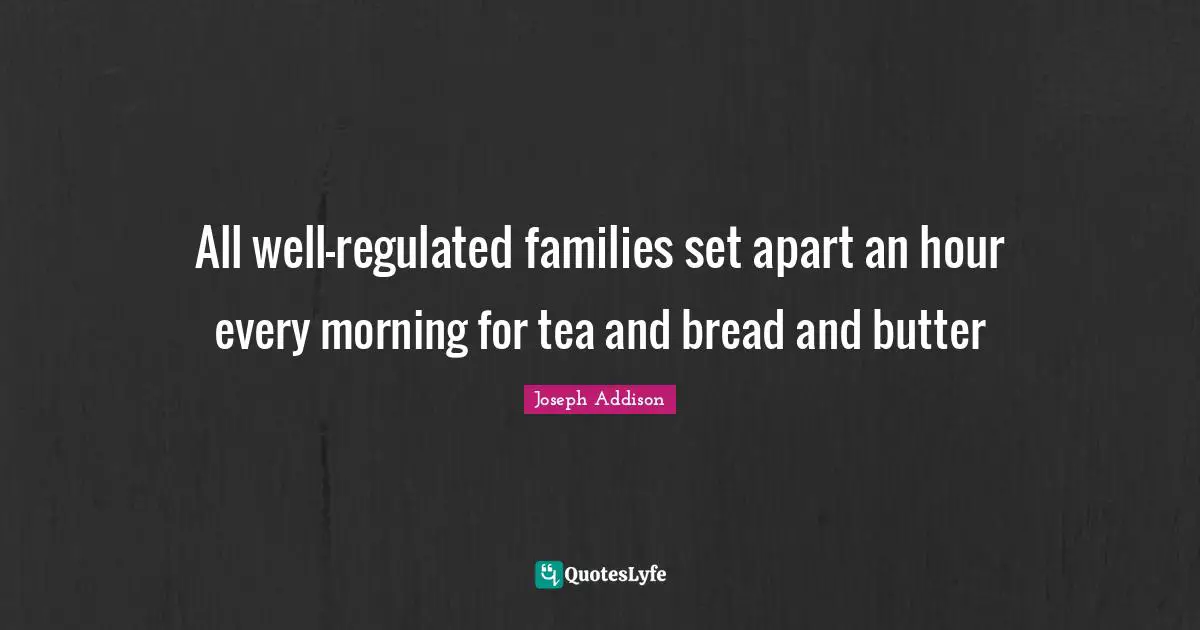 This page presents the quote "All well-regulated families set apart an hour every morning for tea and bread and butter". Author of this quote is Joseph Addison. This quote is about bread, bread and butter, every morning, morning, tea,.