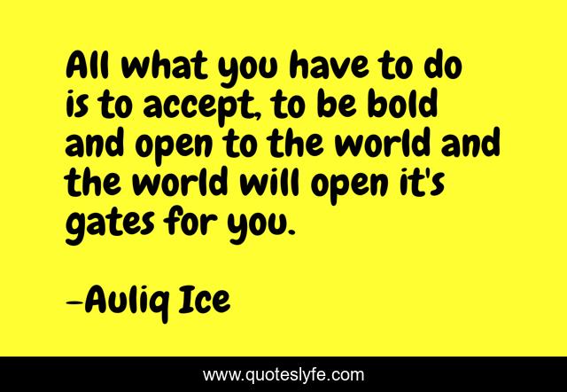 This page presents the quote "All what you have to do is to accept, to be bold and open to the world and the world will open it's gates for you.". Author of this quote is Auliq Ice. This quote is about confidence, success, positive, motivational, trustworthy, optimistic, inspirational, enthusiasm, love-truth,.