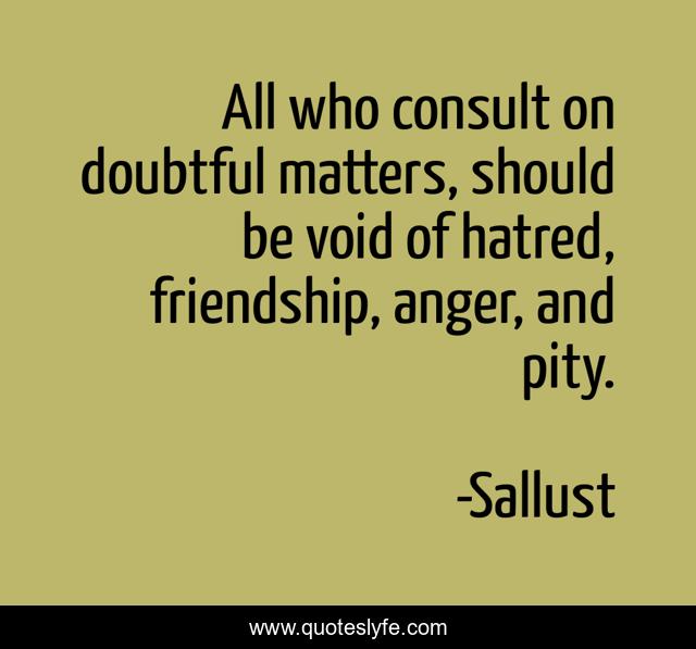 This page presents the quote "All who consult on doubtful matters, should be void of hatred, friendship, anger, and pity.". Author of this quote is Sallust. This quote is about anger, matters, hatred,.