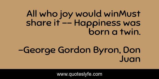 This page presents the quote "All who joy would winMust share it -- Happiness was born a twin.". Author of this quote is George Gordon Byron, Don Juan. This quote is about twin, don-juan, happiness,.