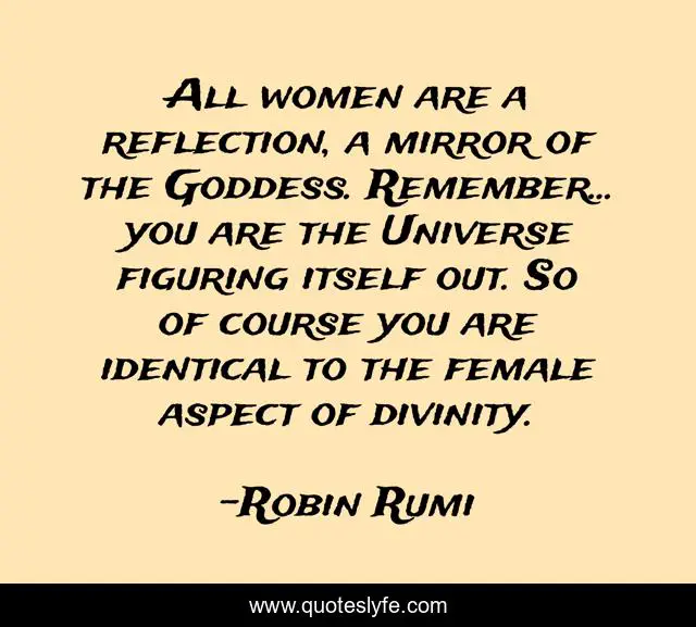 This page presents the quote "All women are a reflection, a mirror of the Goddess. Remember… you are the Universe figuring itself out. So of course you are identical to the female aspect of divinity.". Author of this quote is Robin Rumi. This quote is about goddess, divinity, universe, female-empowerment, feminine-power, women,.