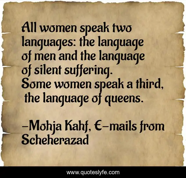 "Mohja Kahf, E-mails from Scheherazad Quotes." Quoteslyfe.com, 2025. Tue. 09 Dec. 2025. <https://www.quoteslyfe.com/quote/All-women-speak-two-languages-the-language-102211>.