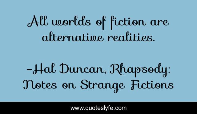 "Hal Duncan, Rhapsody: Notes on Strange Fictions Quotes." Quoteslyfe.com, 2025. Mon. 08 Dec. 2025. <https://www.quoteslyfe.com/quote/All-worlds-of-fiction-are-alternative-realities-157394>.