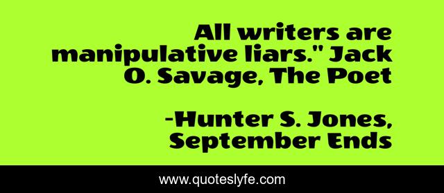 This page presents the quote "All writers are manipulative liars." Jack O. Savage, The Poet". Author of this quote is Hunter S. Jones, September Ends. This quote is about love-triangle, romance-love, contemporary-fiction, love-story, poetry,.
