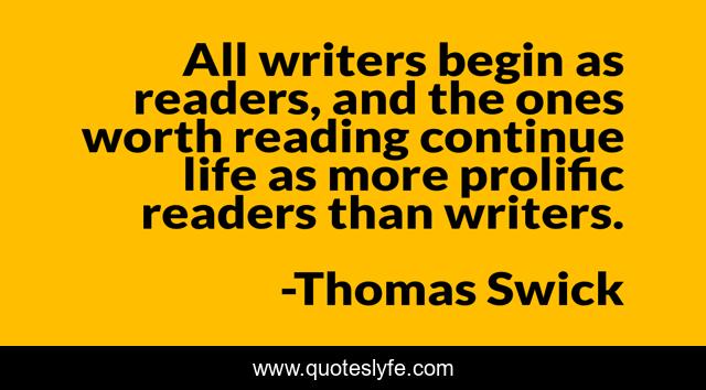This page presents the quote "All writers begin as readers, and the ones worth reading continue life as more prolific readers than writers.". Author of this quote is Thomas Swick. This quote is about reading, curiosity, writing,.
