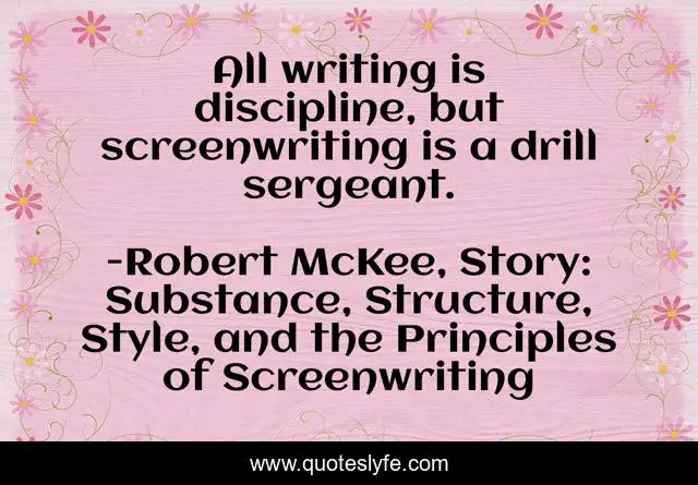 This page presents the quote "All writing is discipline, but screenwriting is a drill sergeant.". Author of this quote is Robert McKee, Story: Substance, Structure, Style, and the Principles of Screenwriting. This quote is about discipline, screenwriting, sergeant, writing,.