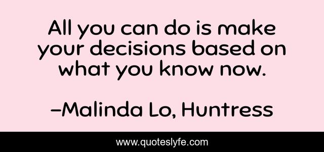 This page presents the quote "All you can do is make your decisions based on what you know now.". Author of this quote is Malinda Lo, Huntress. This quote is about choices, decisions, wisdom,.