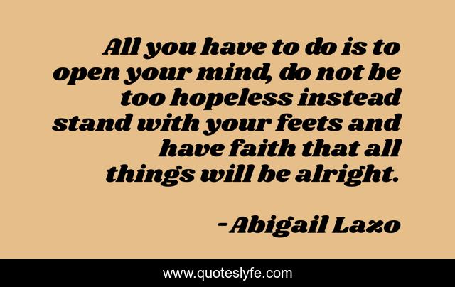 This page presents the quote "All you have to do is to open your mind, do not be too hopeless instead stand with your feets and have faith that all things will be alright.". Author of this quote is Abigail Lazo. .