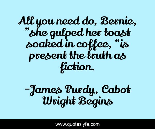 This page presents the quote "All you need do, Bernie, ”she gulped her toast soaked in coffee, “is present the truth as fiction.". Author of this quote is James Purdy, Cabot Wright Begins. This quote is about truth, fiction,.