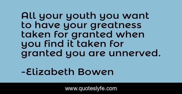 This page presents the quote "All your youth you want to have your greatness taken for granted when you find it taken for granted you are unnerved.". Author of this quote is Elizabeth Bowen. .