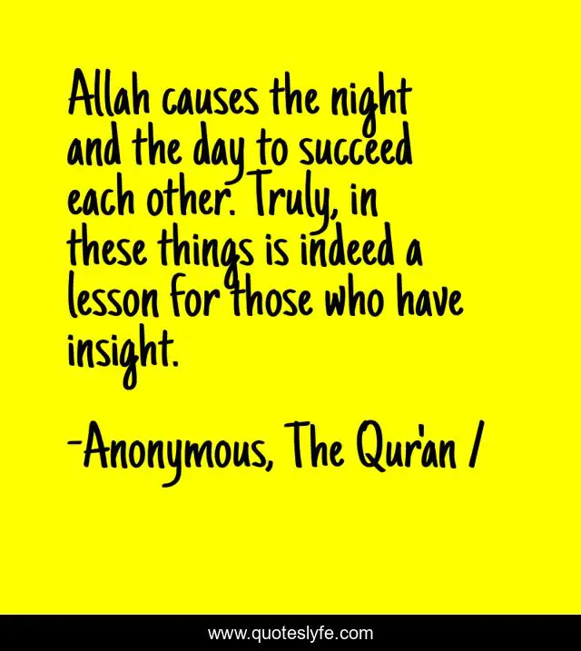 This page presents the quote "Allah causes the night and the day to succeed each other. Truly, in these things is indeed a lesson for those who have insight.". Author of this quote is Anonymous, The Qur'an / القرآن الكريم. This quote is about allah, insight, succeed, night, lesson, day,.