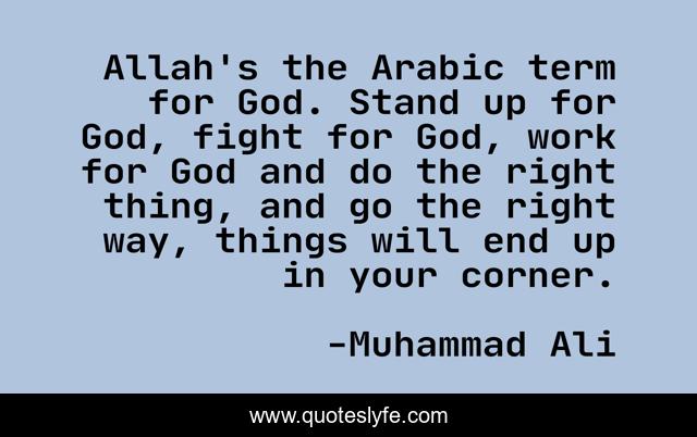 This page presents the quote "Allah's the Arabic term for God. Stand up for God, fight for God, work for God and do the right thing, and go the right way, things will end up in your corner.". Author of this quote is Muhammad Ali. This quote is about god, fight,.