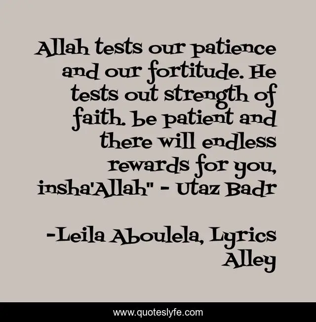 This page presents the quote "Allah tests our patience and our fortitude. He tests out strength of faith. be patient and there will endless rewards for you, insha'Allah" - Utaz Badr". Author of this quote is Leila Aboulela, Lyrics Alley. This quote is about faith, spiritual, islam,.