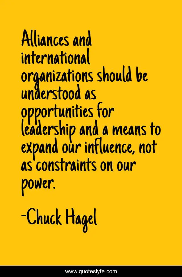 This page presents the quote "Alliances and international organizations should be understood as opportunities for leadership and a means to expand our influence, not as constraints on our power.". Author of this quote is Chuck Hagel. This quote is about influence, power,.