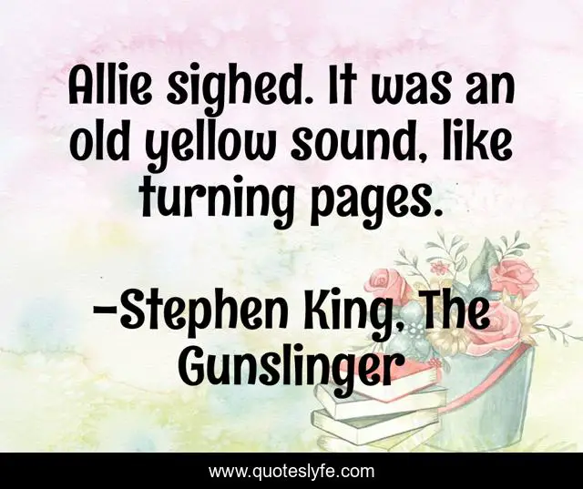 This page presents the quote "Allie sighed. It was an old yellow sound, like turning pages.". Author of this quote is Stephen King, The Gunslinger. This quote is about the-gunslinger, stephen-king, the-dark-tower, nostalgia,.