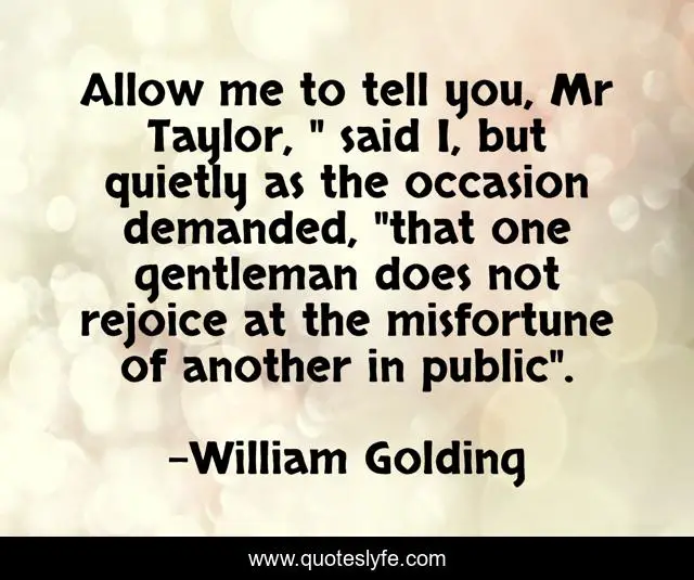 This page presents the quote "Allow me to tell you, Mr Taylor, " said I, but quietly as the occasion demanded, "that one gentleman does not rejoice at the misfortune of another in public".". Author of this quote is William Golding. This quote is about character, gentleman, good-conduct,.
