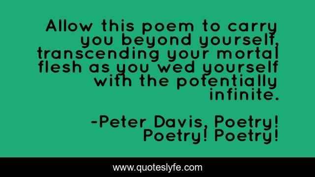 This page presents the quote "Allow this poem to carry you beyond yourself, transcending your mortal flesh as you wed yourself with the potentially infinite.". Author of this quote is Peter Davis, Poetry! Poetry! Poetry!. This quote is about infinite, immortality, art,.
