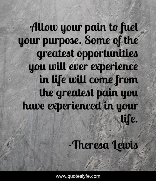 This page presents the quote "Allow your pain to fuel your purpose. Some of the greatest opportunities you will ever experience in life will come from the greatest pain you have experienced in your life.". Author of this quote is Theresa Lewis. This quote is about life, pain, live, purpose,.
