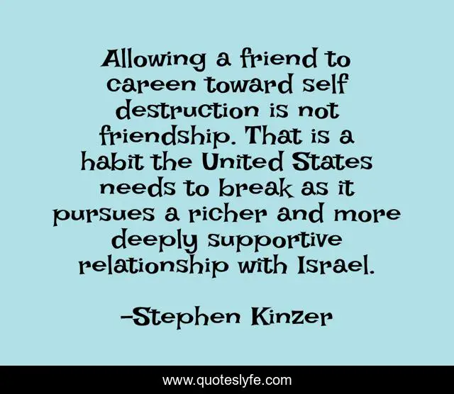 This page presents the quote "Allowing a friend to careen toward self destruction is not friendship. That is a habit the United States needs to break as it pursues a richer and more deeply supportive relationship with Israel.". Author of this quote is Stephen Kinzer. This quote is about self, relationship, friend,.