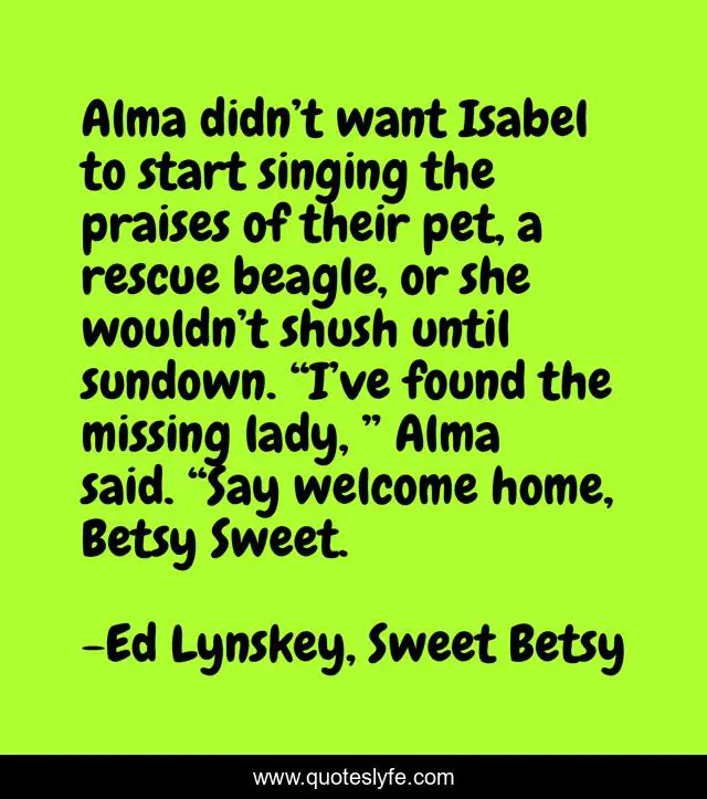 This page presents the quote "Alma didn’t want Isabel to start singing the praises of their pet, a rescue beagle, or she wouldn’t shush until sundown. “I’ve found the missing lady, ” Alma said. “Say welcome home, Betsy Sweet.". Author of this quote is Ed Lynskey, Sweet Betsy. This quote is about humor, cozy-mystery, women-sleuths, cozy-mysteries, romance, mysteries-cozy, agatha-christie, whodunit, cozies,.