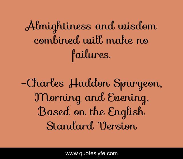 This page presents the quote "Almightiness and wisdom combined will make no failures.". Author of this quote is Charles Haddon Spurgeon, Morning and Evening, Based on the English Standard Version. This quote is about maturation, parenthood, discipleship, intimacy-with-god, sovereignty-of-god,.