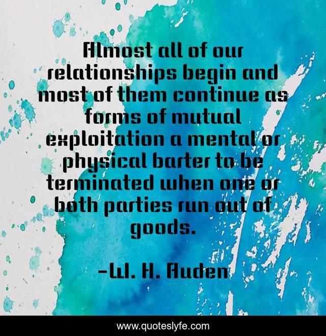 This page presents the quote "Almost all of our relationships begin and most of them continue as forms of mutual exploitation a mental or physical barter to be terminated when one or both parties run out of goods.". Author of this quote is W. H. Auden. This quote is about human, relations,.