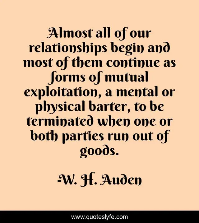 This page presents the quote "Almost all of our relationships begin and most of them continue as forms of mutual exploitation, a mental or physical barter, to be terminated when one or both parties run out of goods.". Author of this quote is W. H. Auden. This quote is about relationships, run, mental,.
