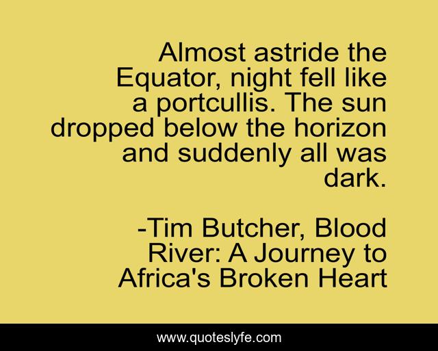 This page presents the quote "Almost astride the Equator, night fell like a portcullis. The sun dropped below the horizon and suddenly all was dark.". Author of this quote is Tim Butcher, Blood River: A Journey to Africa's Broken Heart. This quote is about tropics, congo, africa, travel-writing,.