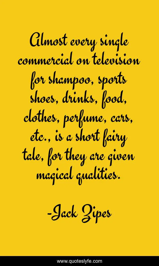 This page presents the quote "Almost every single commercial on television for shampoo, sports shoes, drinks, food, clothes, perfume, cars, etc., is a short fairy tale, for they are given magical qualities.". Author of this quote is Jack Zipes. This quote is about food, short, shoes,.