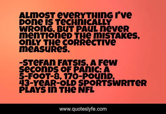 This page presents the quote "Almost everything I've done is technically wrong, but Paul never mentioned the mistakes, only the corrective measures.". Author of this quote is Stefan Fatsis, A Few Seconds of Panic: A 5-Foot-8, 170-Pound, 43-Year-Old Sportswriter Plays in the NFL. This quote is about counseling, coaching, encouragement,.