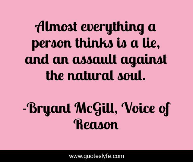 This page presents the quote "Almost everything a person thinks is a lie, and an assault against the natural soul.". Author of this quote is Bryant McGill, Voice of Reason. This quote is about thinking, lie, assault, natural-soul,.