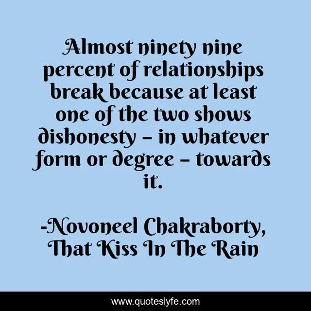 "Novoneel Chakraborty, That Kiss In The Rain Quotes." Quoteslyfe.com, 2025. Mon. 08 Dec. 2025. <https://www.quoteslyfe.com/quote/Almost-ninety-nine-percent-of-relationships-break-191431>.