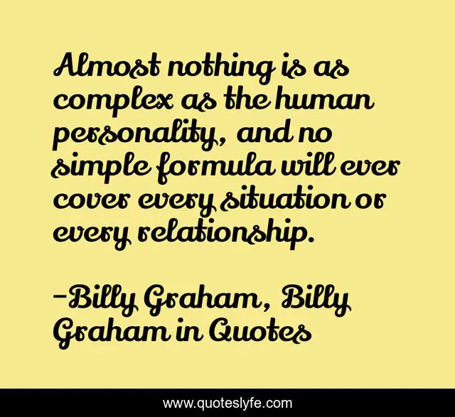 This page presents the quote "Almost nothing is as complex as the human personality, and no simple formula will ever cover every situation or every relationship.". Author of this quote is Billy Graham, Billy Graham in Quotes. This quote is about billy-graham, people,.