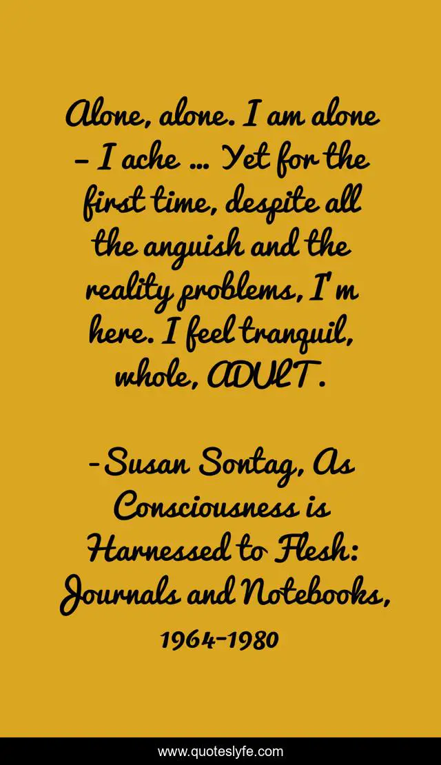 This page presents the quote "Alone, alone. I am alone – I ache … Yet for the first time, despite all the anguish and the reality problems, I’m here. I feel tranquil, whole, ADULT.". Author of this quote is Susan Sontag, As Consciousness is Harnessed to Flesh: Journals and Notebooks, 1964-1980. This quote is about yearning, loneliness, peace, growing-pains,.