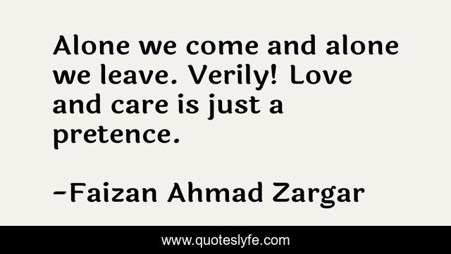This page presents the quote "Alone we come and alone we leave. Verily! Love and care is just a pretence.". Author of this quote is Faizan Ahmad Zargar. This quote is about love, affection, care,.