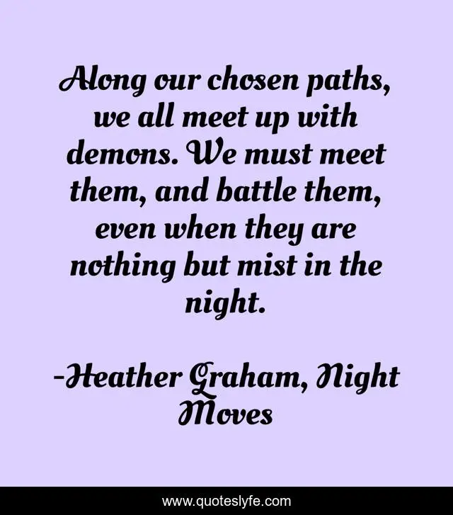 This page presents the quote "Along our chosen paths, we all meet up with demons. We must meet them, and battle them, even when they are nothing but mist in the night.". Author of this quote is Heather Graham, Night Moves. This quote is about positive, confidence, motivational, optimistic,.
