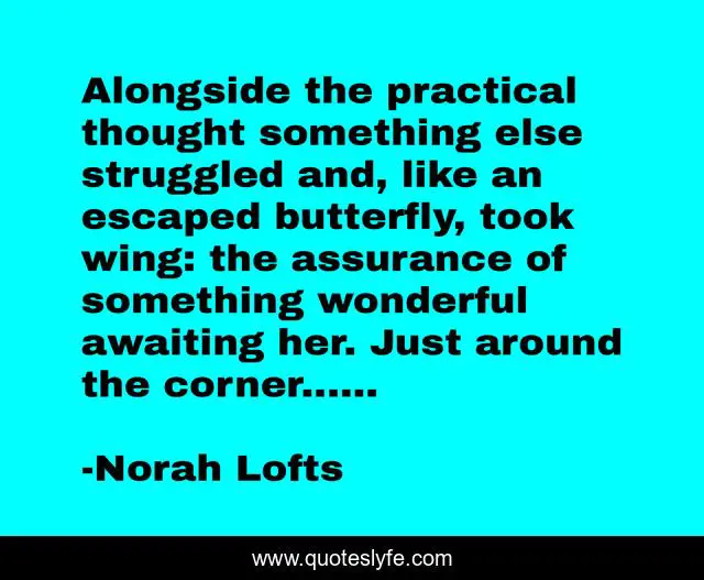 This page presents the quote "Alongside the practical thought something else struggled and, like an escaped butterfly, took wing: the assurance of something wonderful awaiting her. Just around the corner......". Author of this quote is Norah Lofts. This quote is about butterflies, optimism, daisy,.