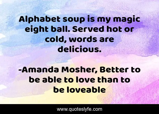 This page presents the quote "Alphabet soup is my magic eight ball. Served hot or cold, words are delicious.". Author of this quote is Amanda Mosher, Better to be able to love than to be loveable. This quote is about magic, alphabet-soup, language, soup, hot, delicious, magic-eight-ball, cold, words,.