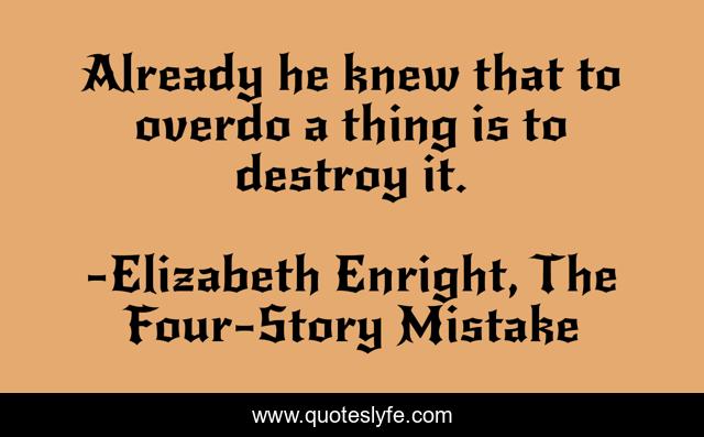This page presents the quote "Already he knew that to overdo a thing is to destroy it.". Author of this quote is Elizabeth Enright, The Four-Story Mistake. This quote is about simplicity, overdoing, balance, fragilty, life-lessons,.