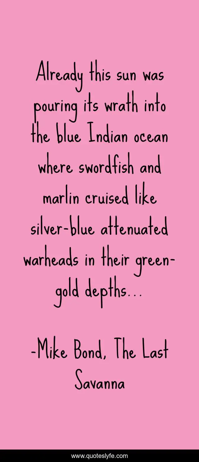 This page presents the quote "Already this sun was pouring its wrath into the blue Indian ocean where swordfish and marlin cruised like silver-blue attenuated warheads in their green-gold depths...". Author of this quote is Mike Bond, The Last Savanna. This quote is about blue, indian-ocean, sun, oceans, africa, marlin, depths, the-last-savanna, swordfish,.